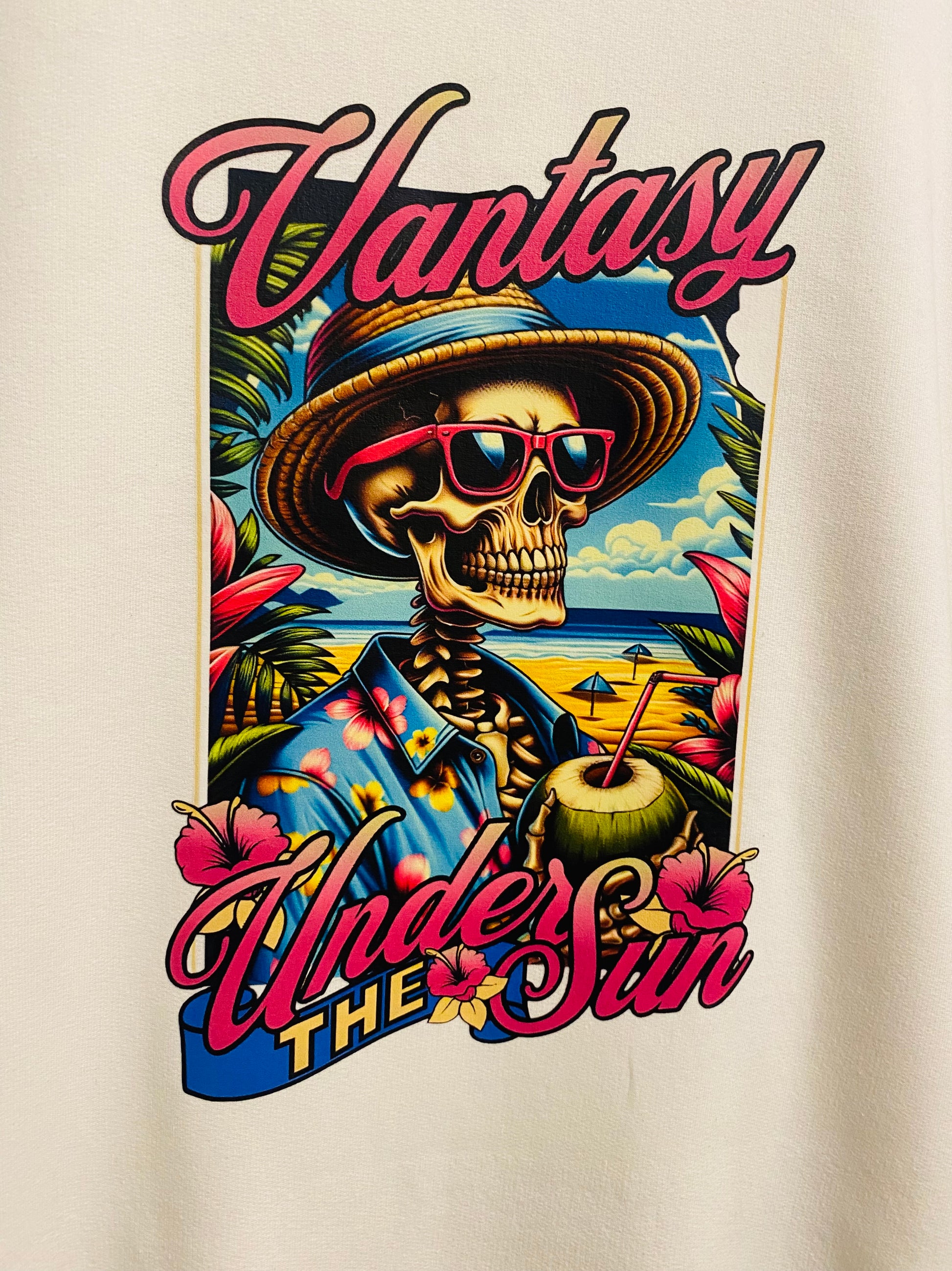 “Under the Sun” design captures the ultimate vanlife attitude — chilled, adventurous, and just a little wild. Featuring a vibrant, skull-in-shades beach scene with retro colours and tropical details, this piece is a head-turner whether you're at a festival, on the road, or just soaking up the sun.
